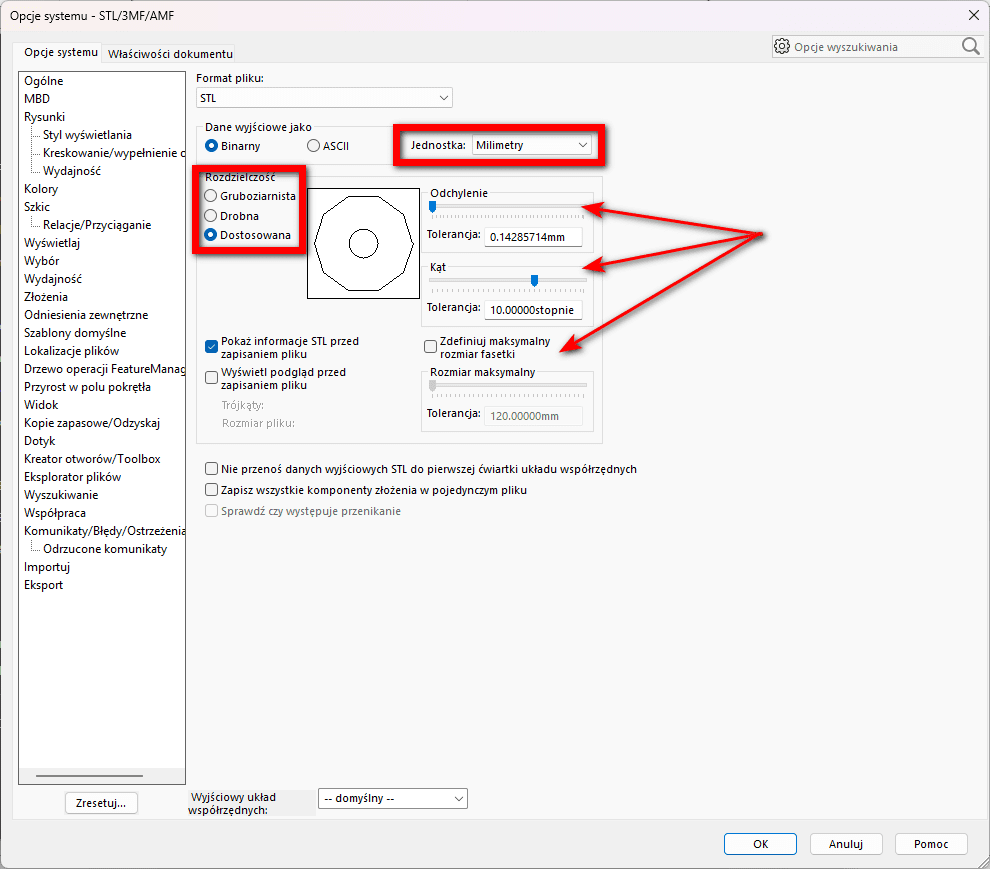 • Przy eksporcie do STL SOLIDWORKS pyta o Tolerancję odchylenia i Tolerancję kąta.