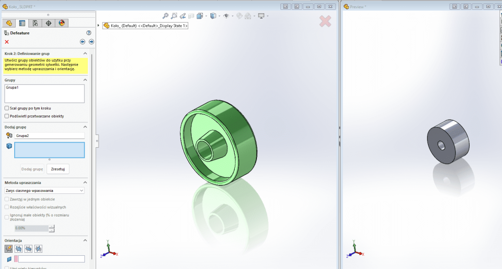 • Skorzystaj z narzędzia Defeature dla zespołów: Narzędzia > Defeature usuwa wewnętrzne detale przed eksportem, co znacząco zmniejsza plik STL.