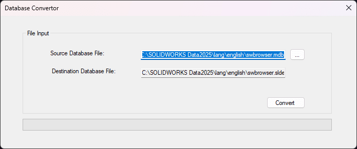 To narzędzie konwertuje bazę danych Toolbox ze starego formatu .mdb (Microsoft Access) na nowszy format .sldedb wprowadzony w najnowszych wersjach SOLIDWORKS. Format .sldedb jest bardziej bezpieczny, skalowalny i stabilny, co znacząco ułatwia dalszą pracę z Toolbox. Używaj tego narzędzia tylko podczas aktualizacji formatu bazy Toolbox.