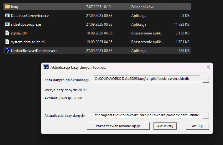 To narzędzie skanuje i aktualizuje bazę Toolbox pod kątem zgodności, integralności i wersji. Jest często używane podczas aktualizacji do nowszych wersji SOLIDWORKS.