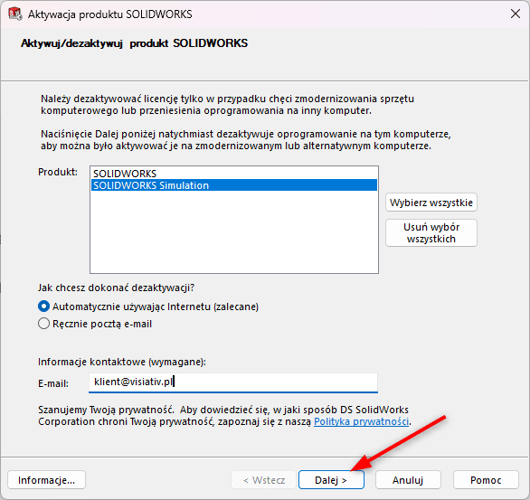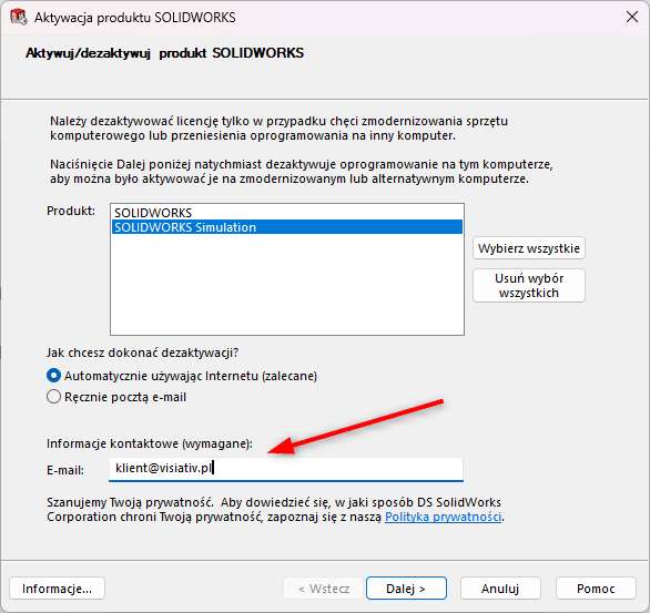 W kolejnym kroku program poprosi o podanie adresu e-mail. Wprowadź swój adres, który był używany przy aktywacji licencji. To umożliwi jej późniejszą aktywację na nowym komputerze.
